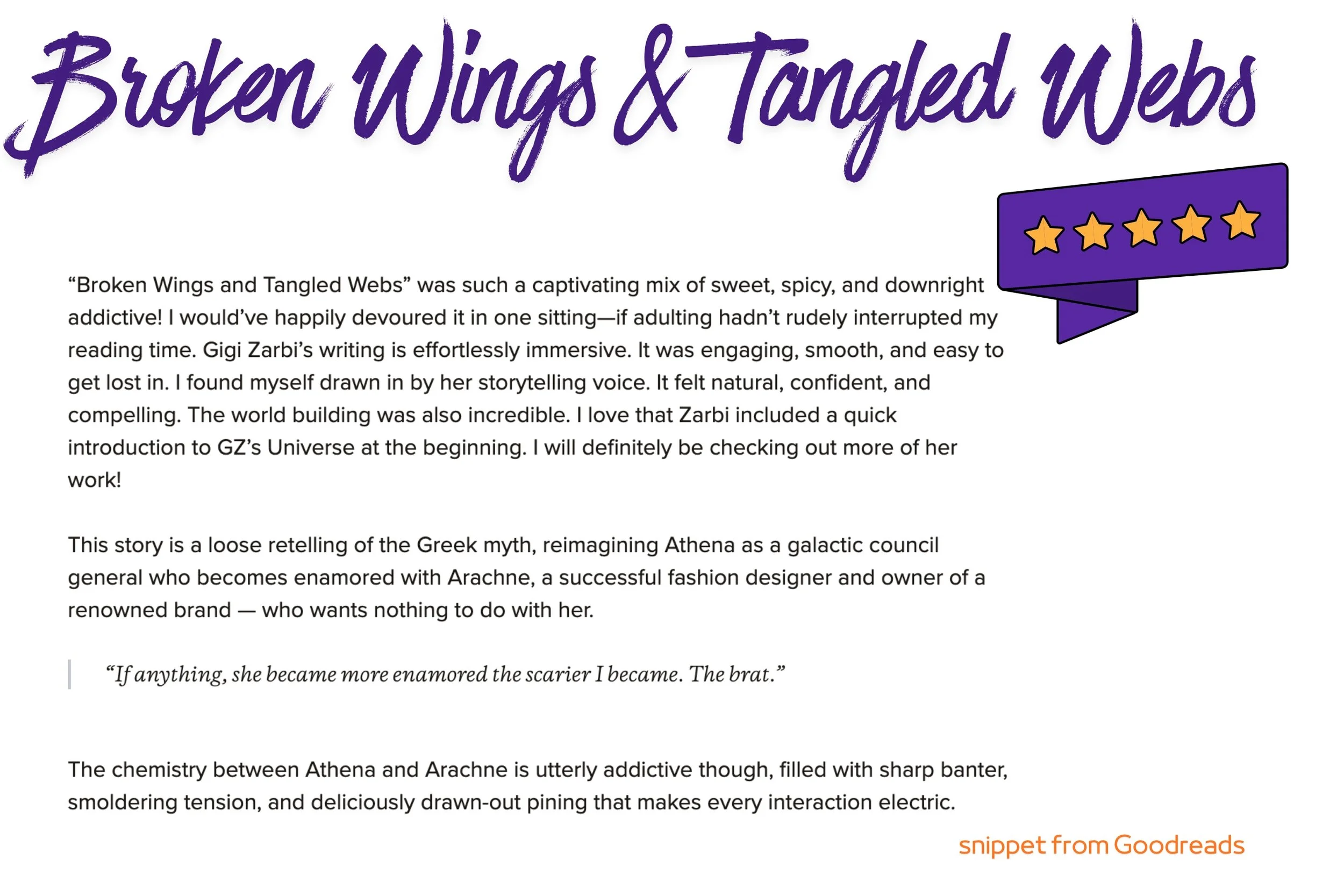 Broken Wings & Tangled Webs is a short and sweet, but dark and comedic, Arachne x Athena, modern romantasy, Greek retelling.